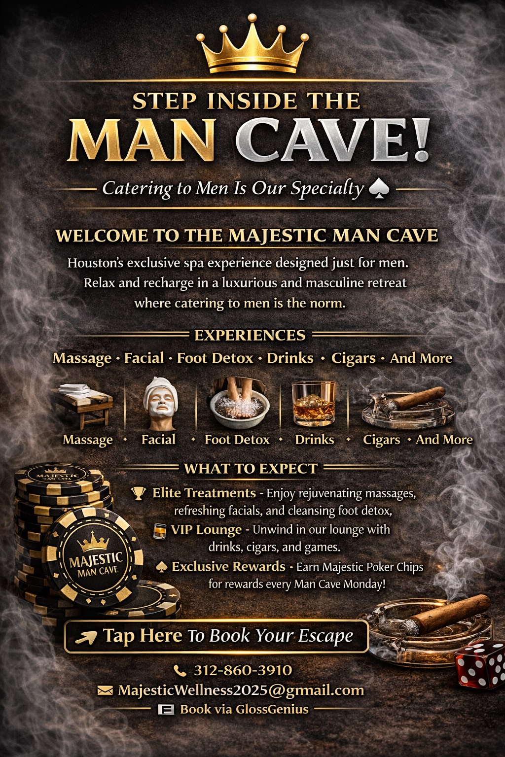 Majestic Man Cave is Houston’s premier men’s wellness lounge—designed for relaxation, confidence, and community. Facials, massages, foot detox, cigars, drinks, and more… all in one elevated space.